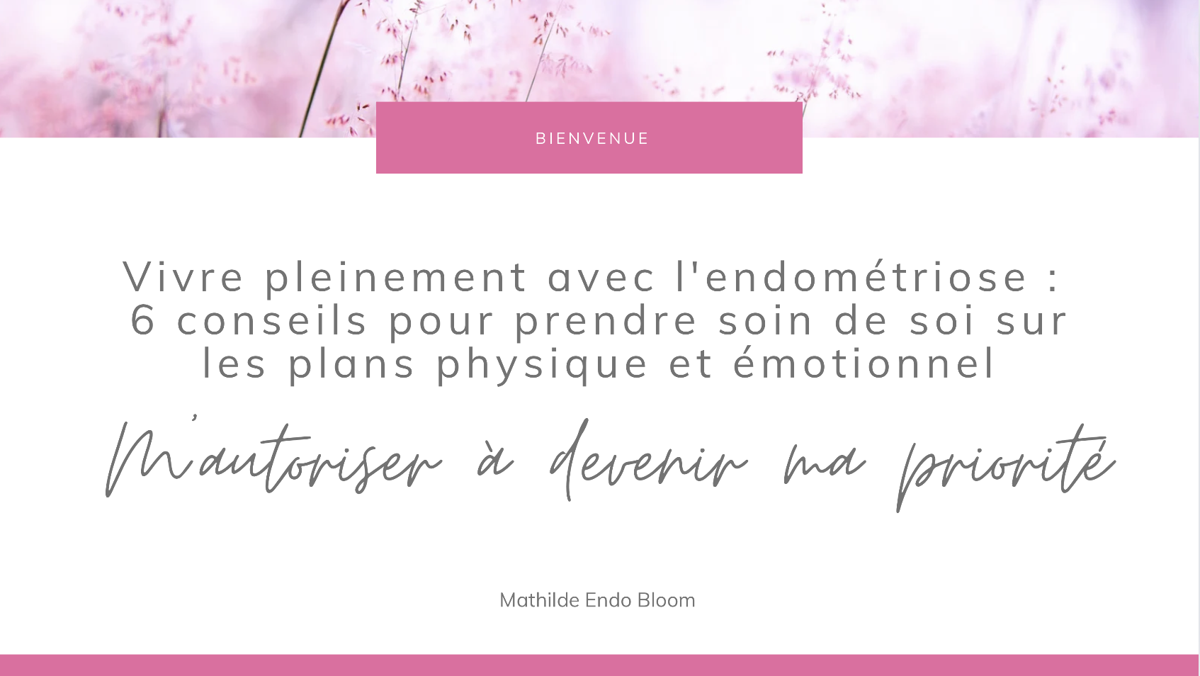 Tu souffres d’endométriose et cherches des solutions pour mieux gérer ton quotidien ? Rejoins-moi pour une conférence en ligne exceptionnelle : "Vivre pleinement avec l'Endométriose : 6 conseils pour prendre soin de soi sur les plans physique et émotionnel". Cette conférence est spécialement conçue pour t’aider à devenir ta priorité, malgré l’endométriose.
